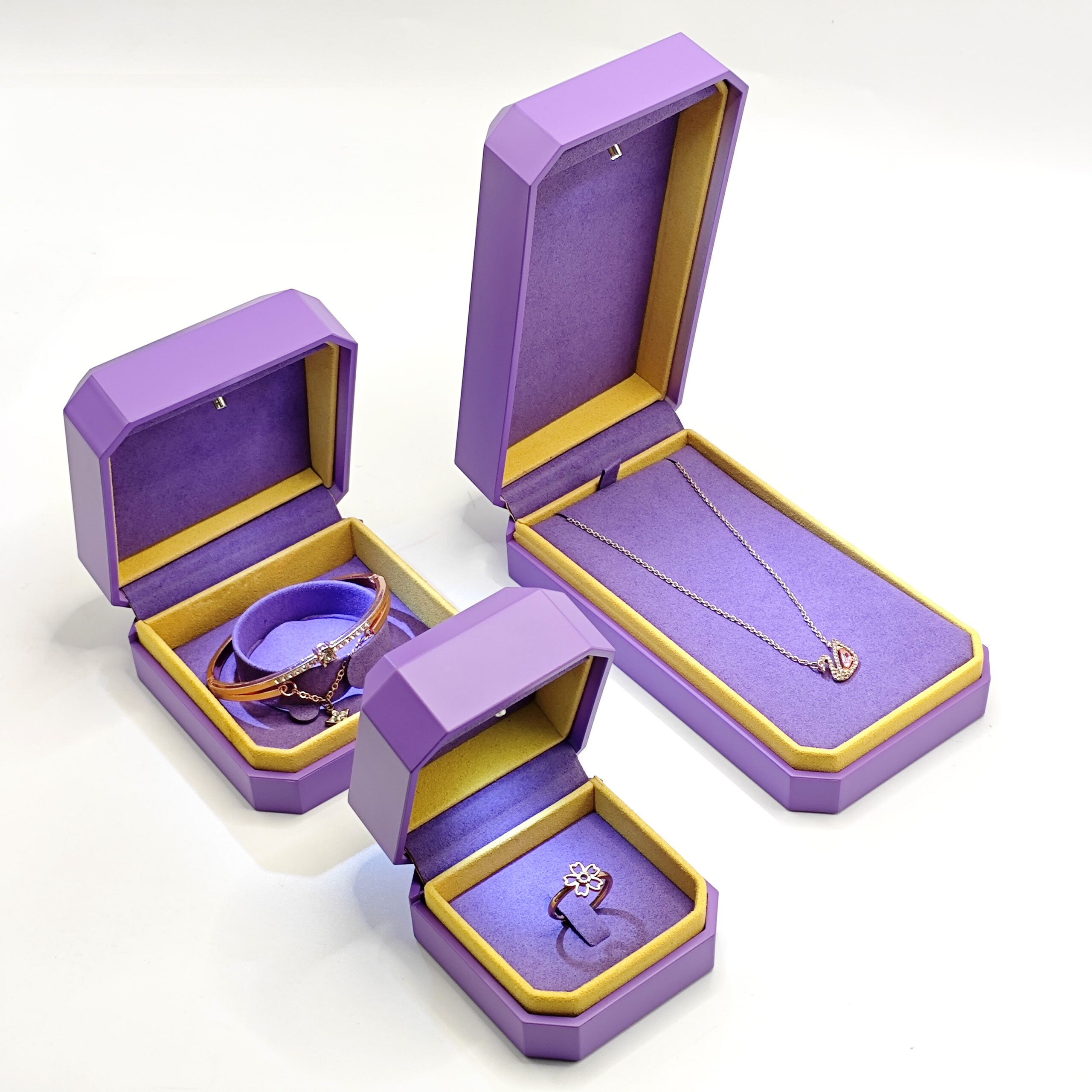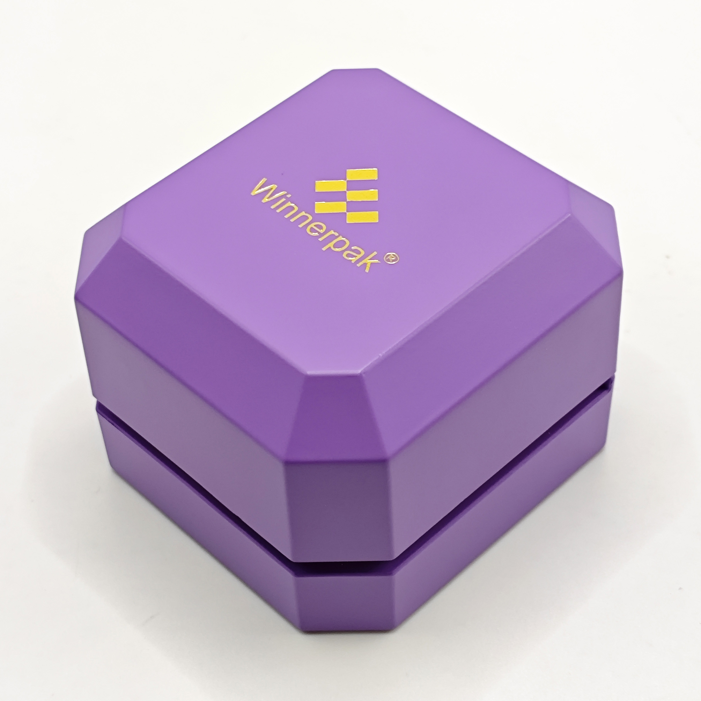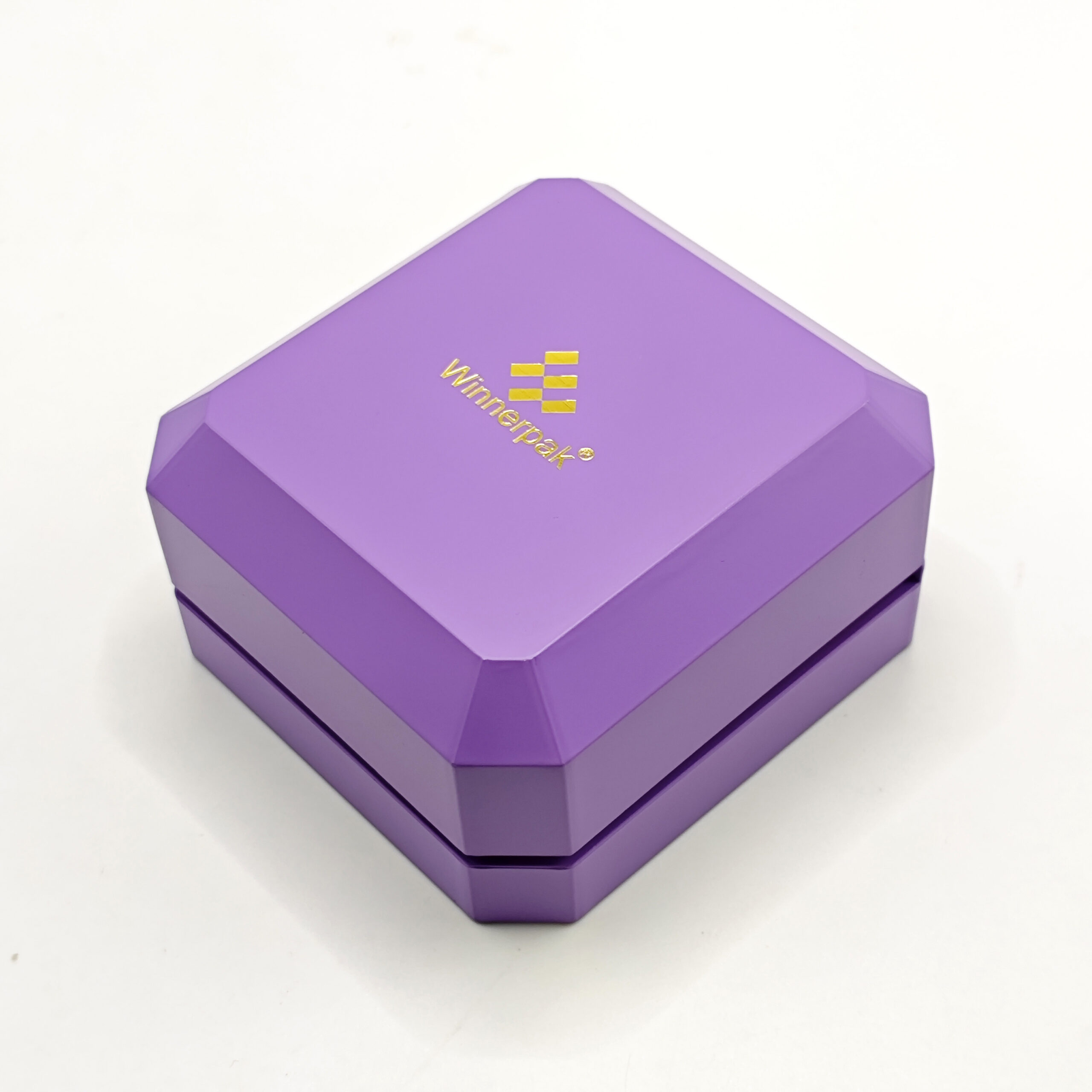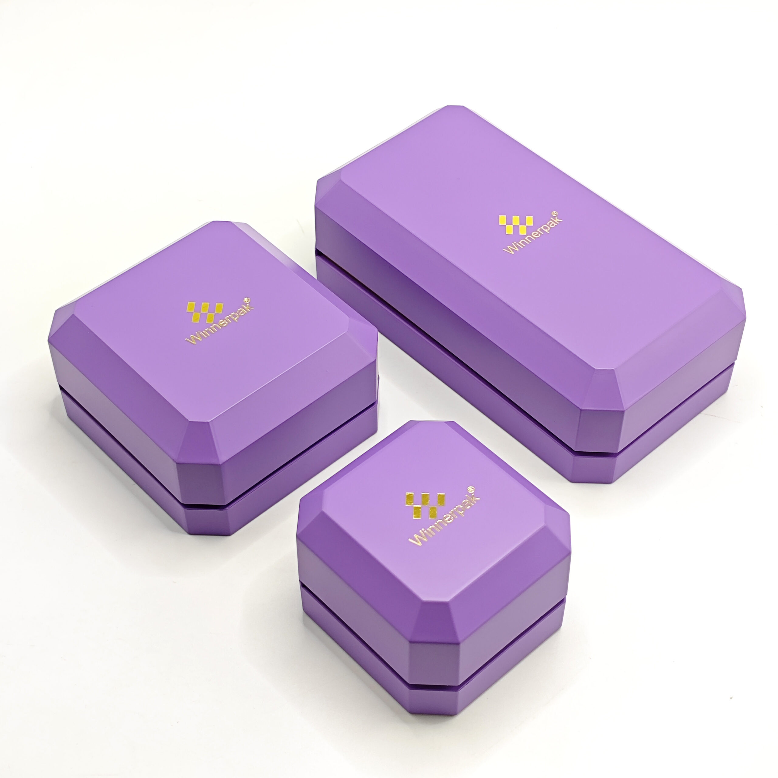 Elevate your unwrapping experience with LE03-PR, a luxury jewelry box set inspired by Messika brand packaging. Each rigid box is designed for superior presentation and retail display, with a purple matte painted PS frame, precision-cut beveled edges, and an optional LED light placed in the lid liner to highlight jewels upon opening.