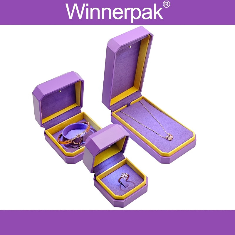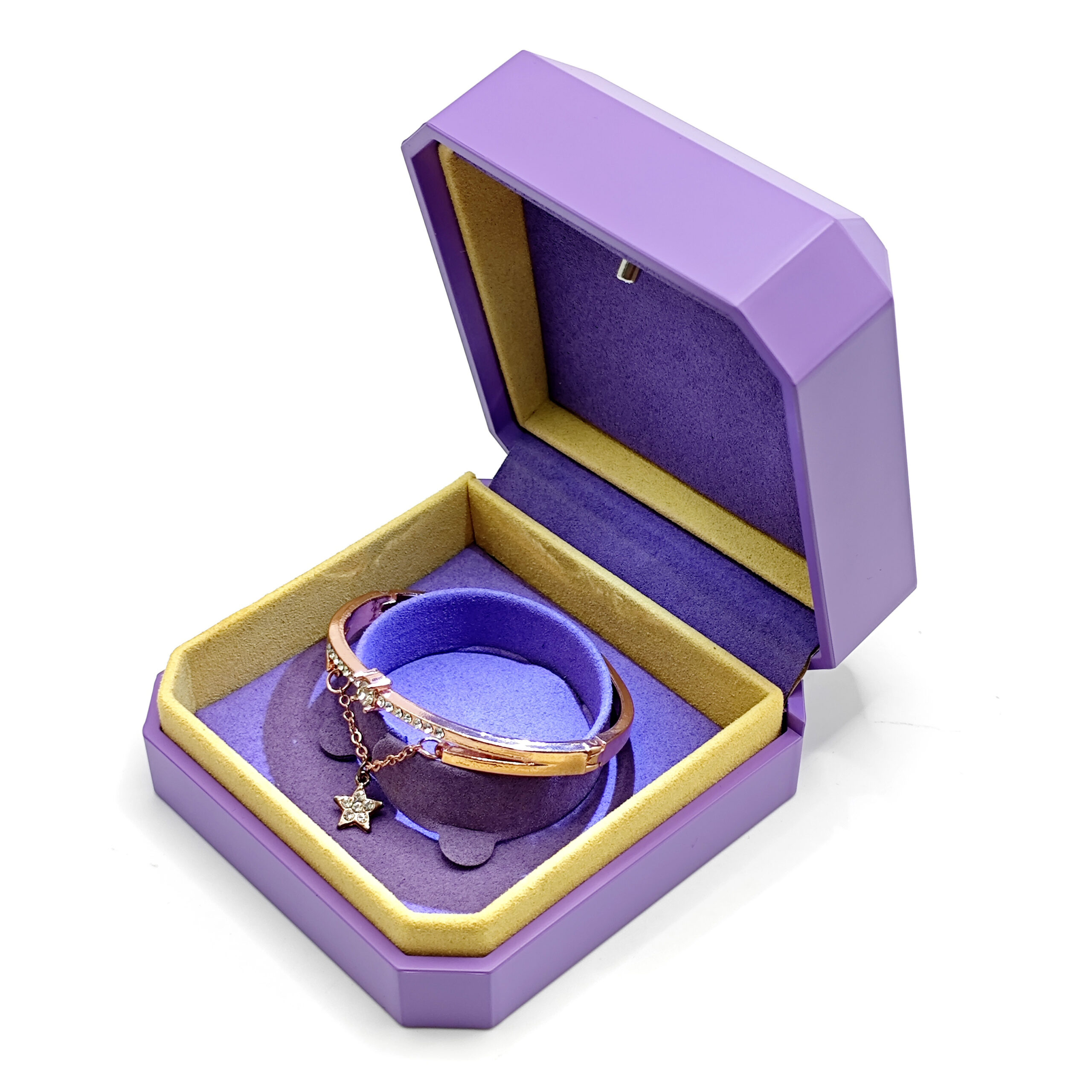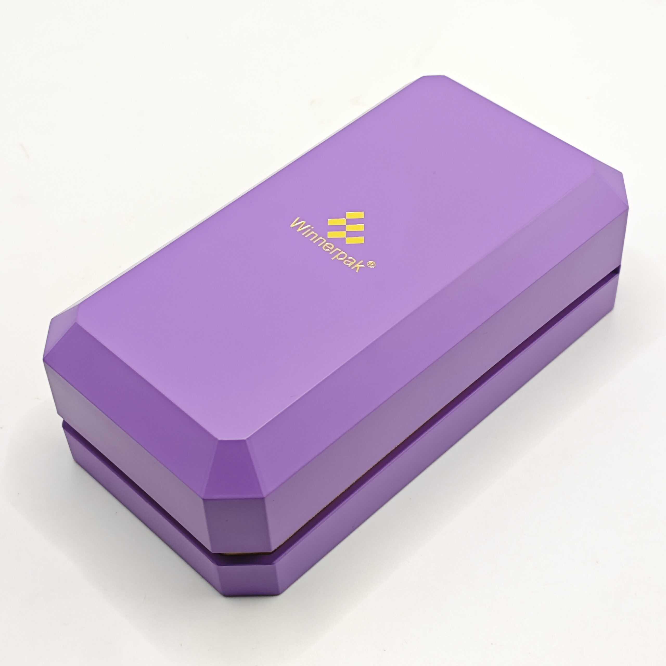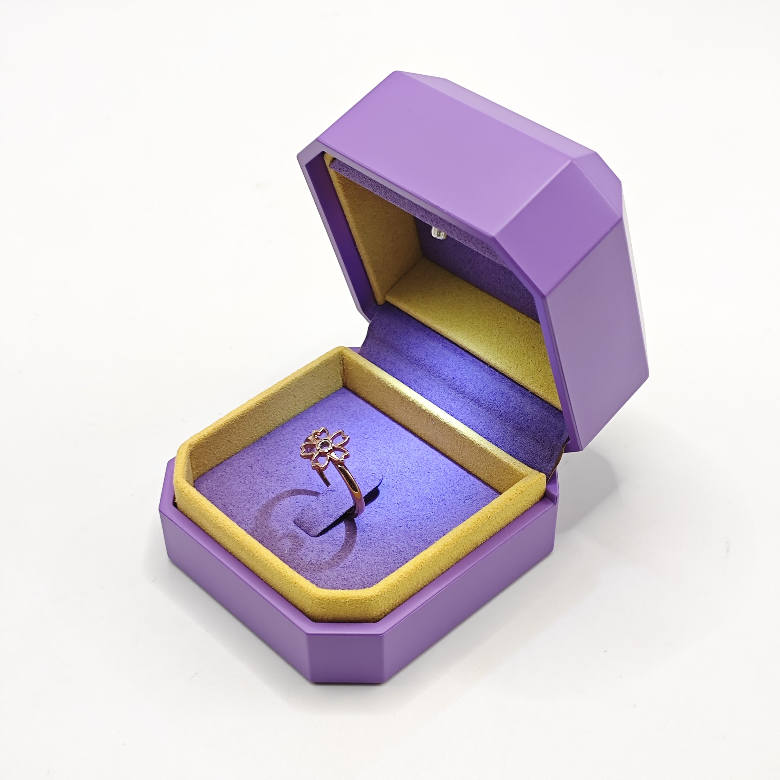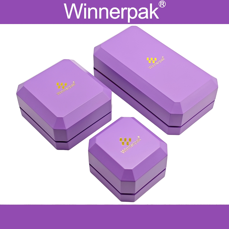 Elevate your unwrapping experience with LE03-PR, a luxury jewelry box set inspired by Messika brand packaging. Each rigid box is designed for superior presentation and retail display, with a purple matte painted PS frame, precision-cut beveled edges, and an optional LED light placed in the lid liner to highlight jewels upon opening.