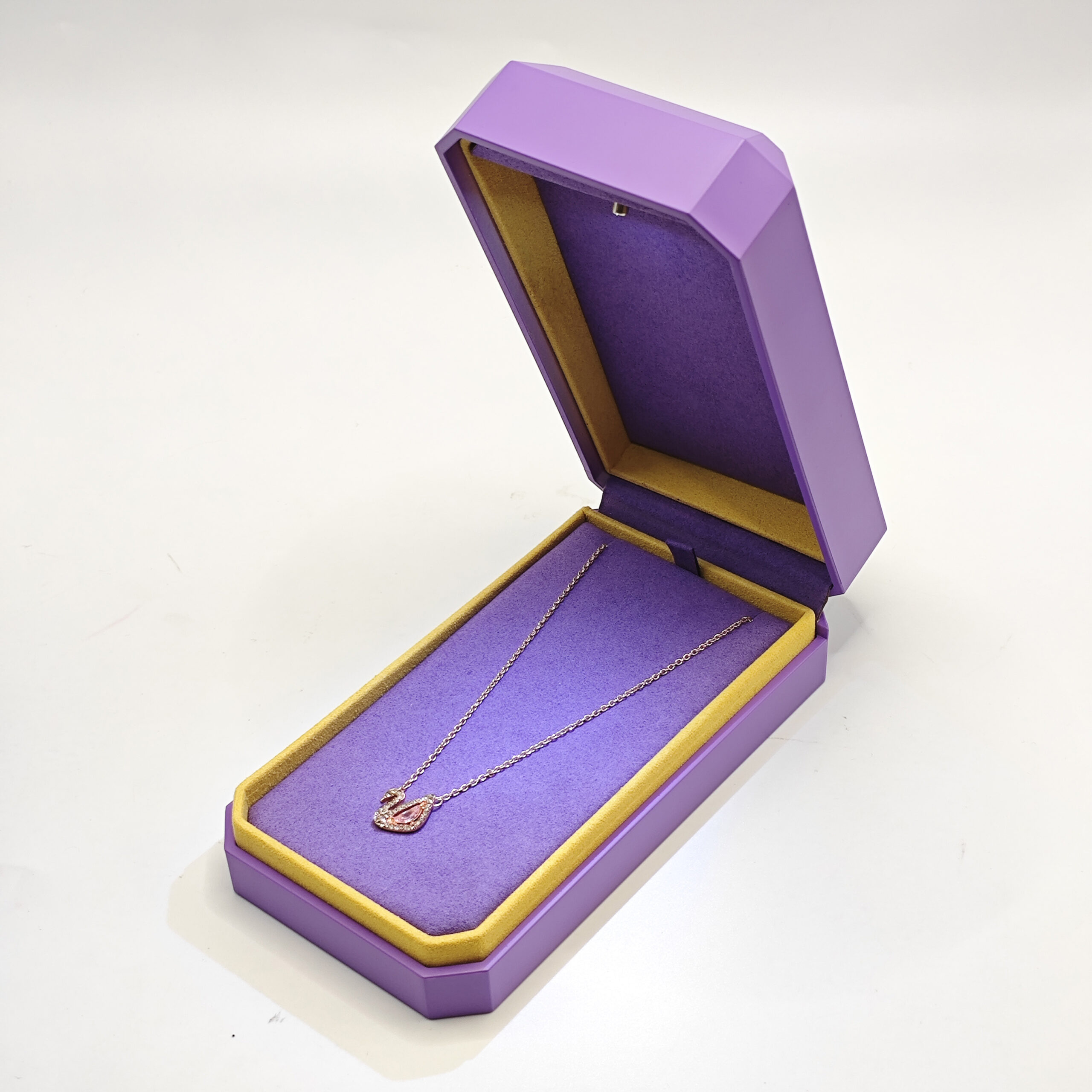 With the LE03-PR series, a high-end jewelry box with LED lighting that highlights your pieces as soon as the lid opens, you can improve presentation and sales. This rigid box, which was inspired by the packaging of the Messika brand, has luxury microsuede interiors, purple matte PS frames, and angled-cut corners. For brand consistency, custom logo printing is available at wholesale prices.