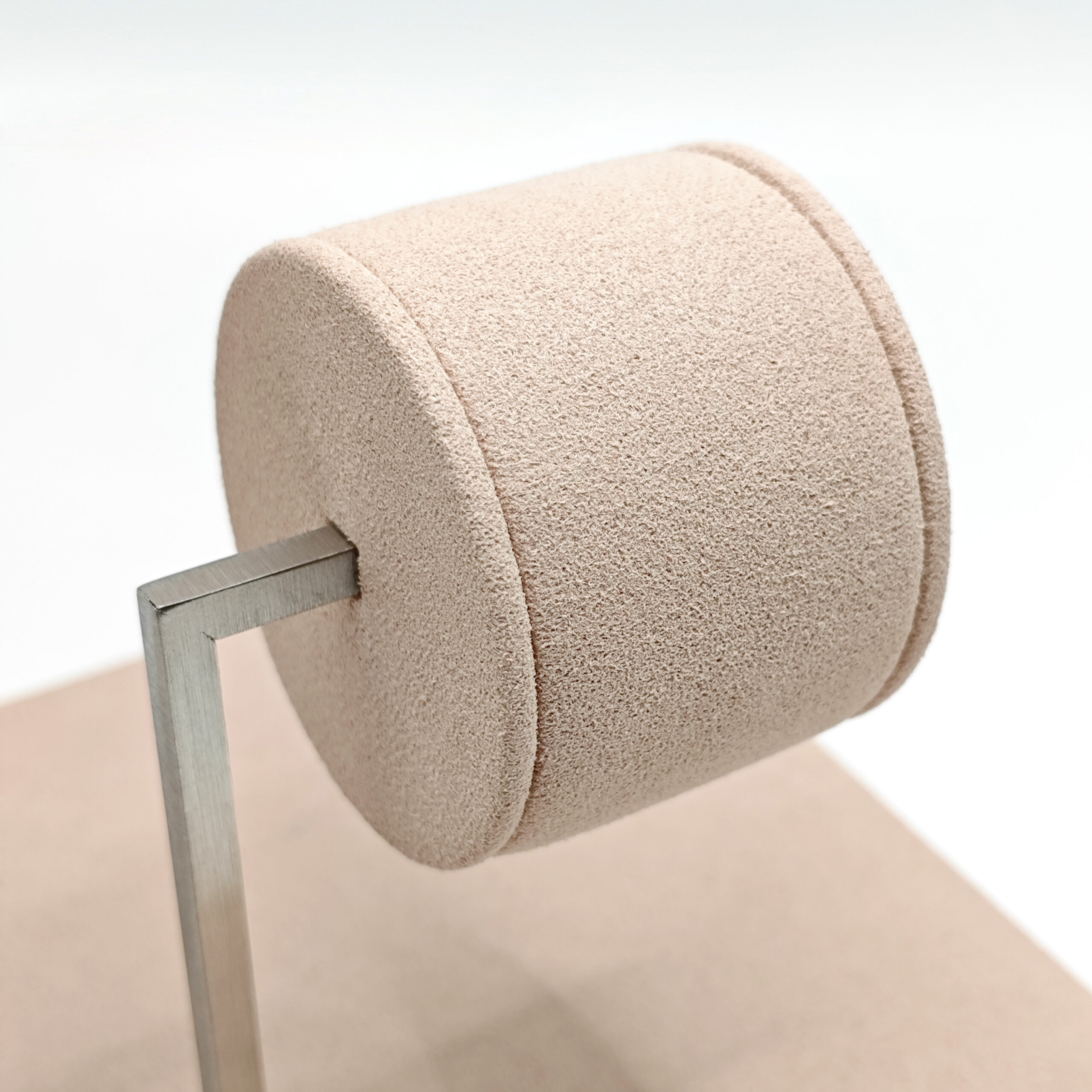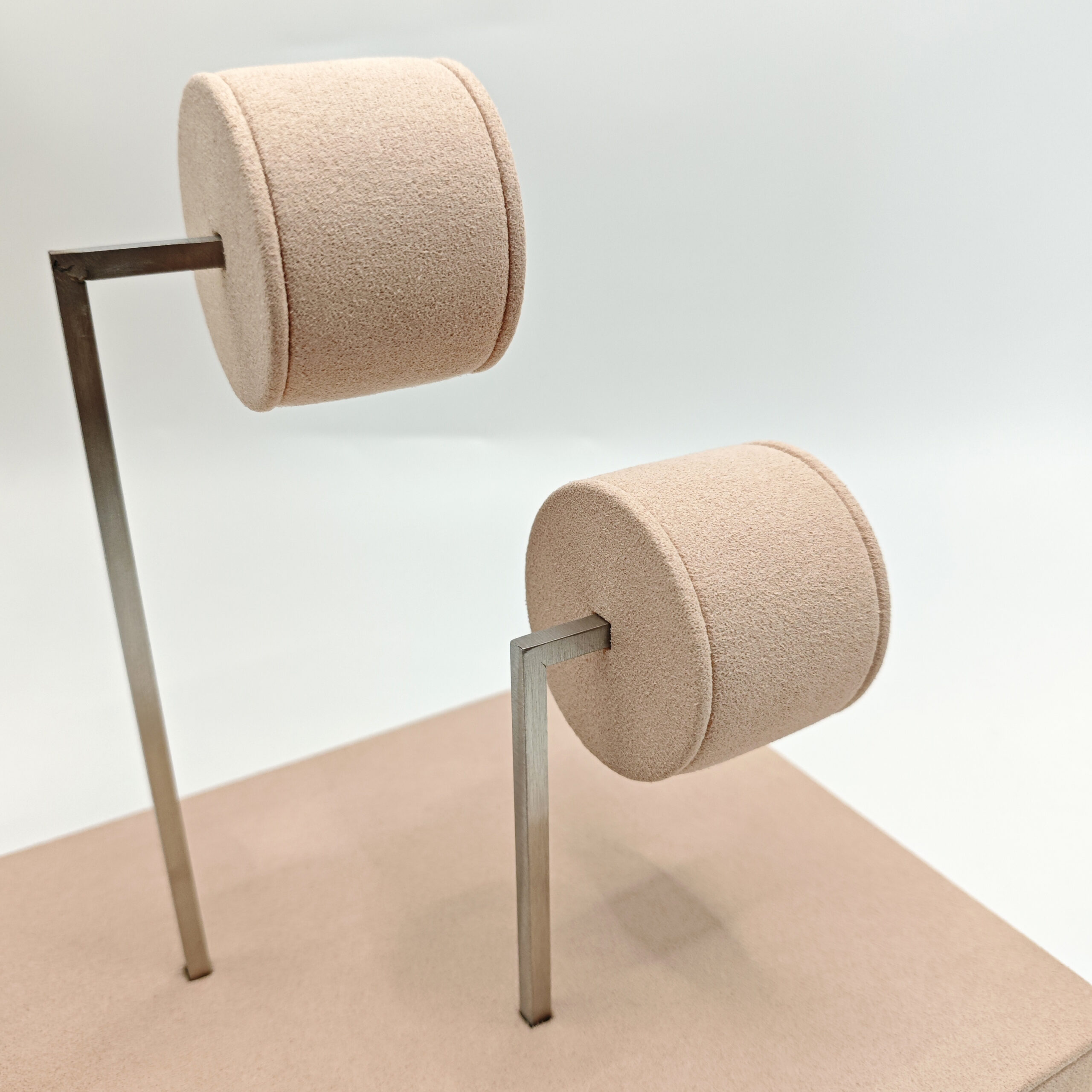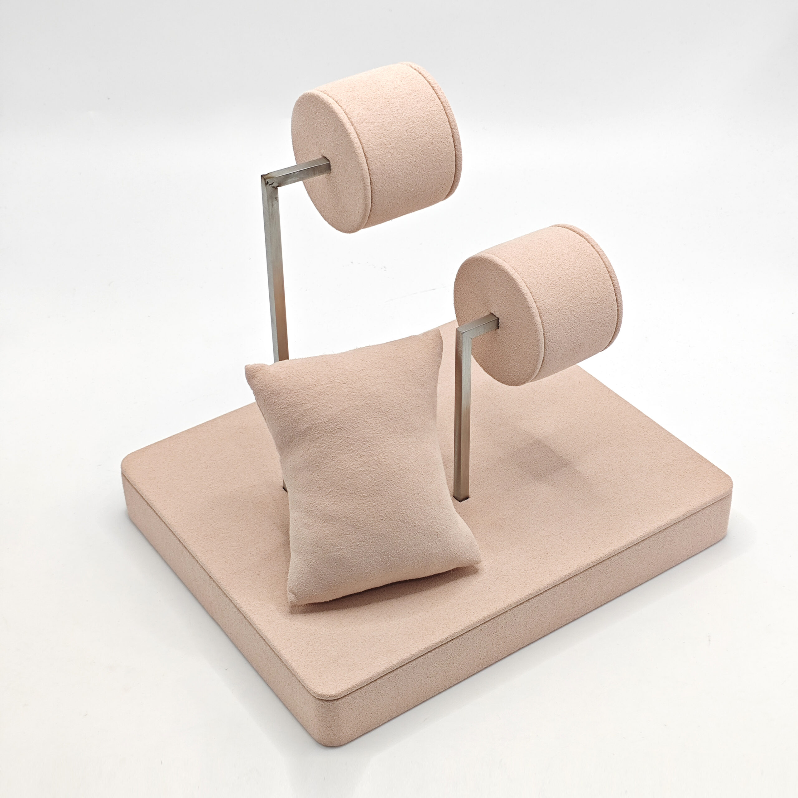 Custom + wholesale: With a MOQ of 30 sets, color customization is possible; manufacturing is reliable, and shipping is available worldwide. creates a professional countertop jewelry display by combining a moving pillow display, two adjustable stainless-steel drum posts, and a soft pink microfiber base. This jewelry display arrangement is designed to accommodate wholesale orders and custom finishes for retail showcases, window settings, and product photography.