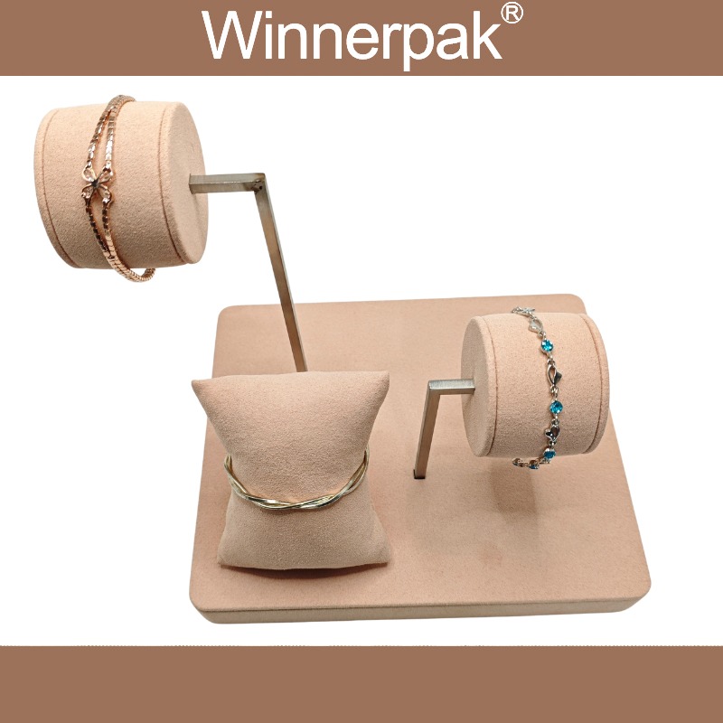 Display watches, bangles, and bracelets that seem upscale and take up little room. The three-in-one bangles, watches, and bracelets that seem upscale and take up little room. The BHS3‑1 3-in-1 bangle display is a professional countertop jewelry display that includes a movable pillow display, two adjustable stainless-steel drum posts, and a soft pink microfiber base. This jewelry display arrangement is designed to accommodate wholesale orders and custom finishes for retail showcases, window settings, and product photography.