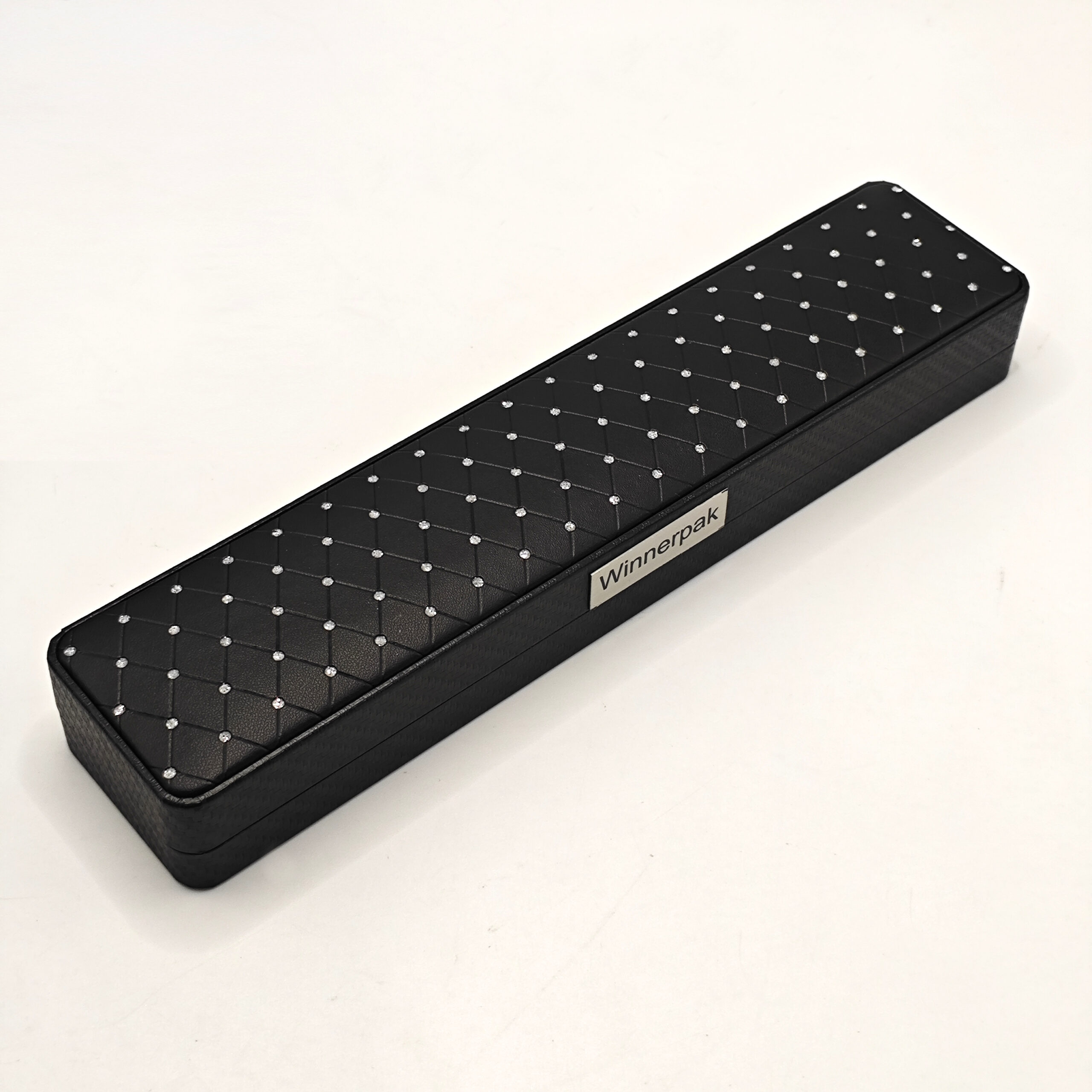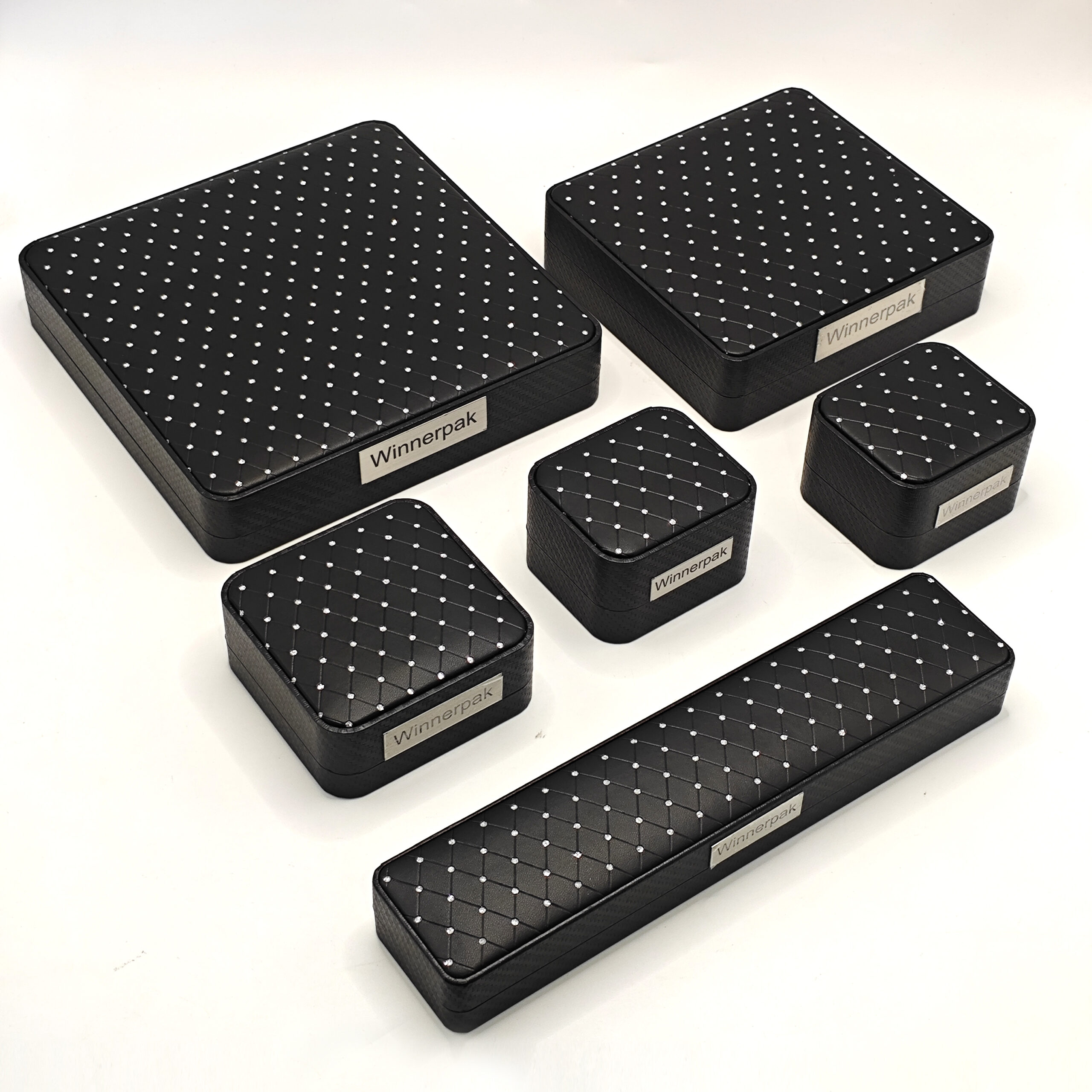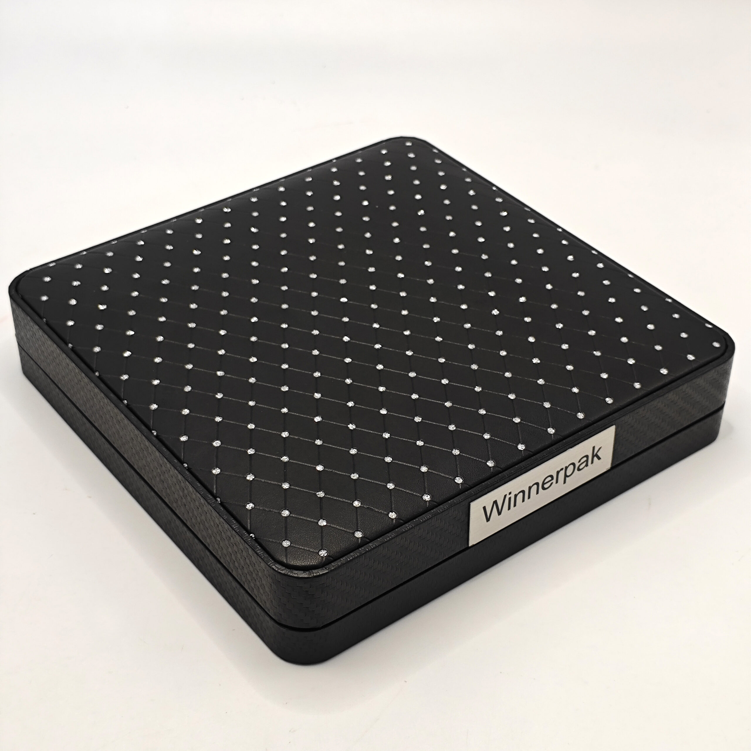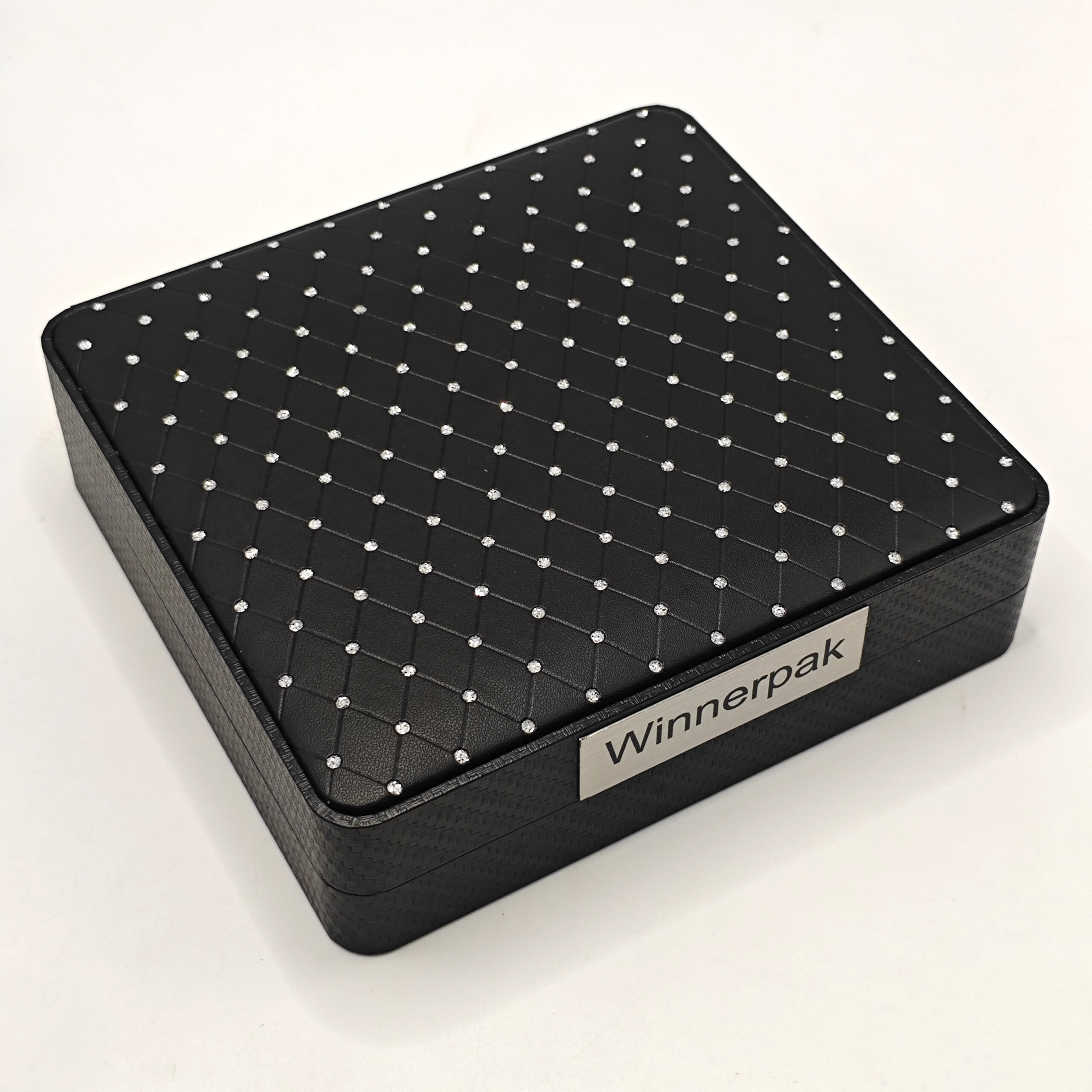 Luxury Materials: The sides of the box are covered in deep black leatherette with a woven pattern, and the top is made of shimmering satin rhinestones, which is a real standout among luxury jewelry box makers.