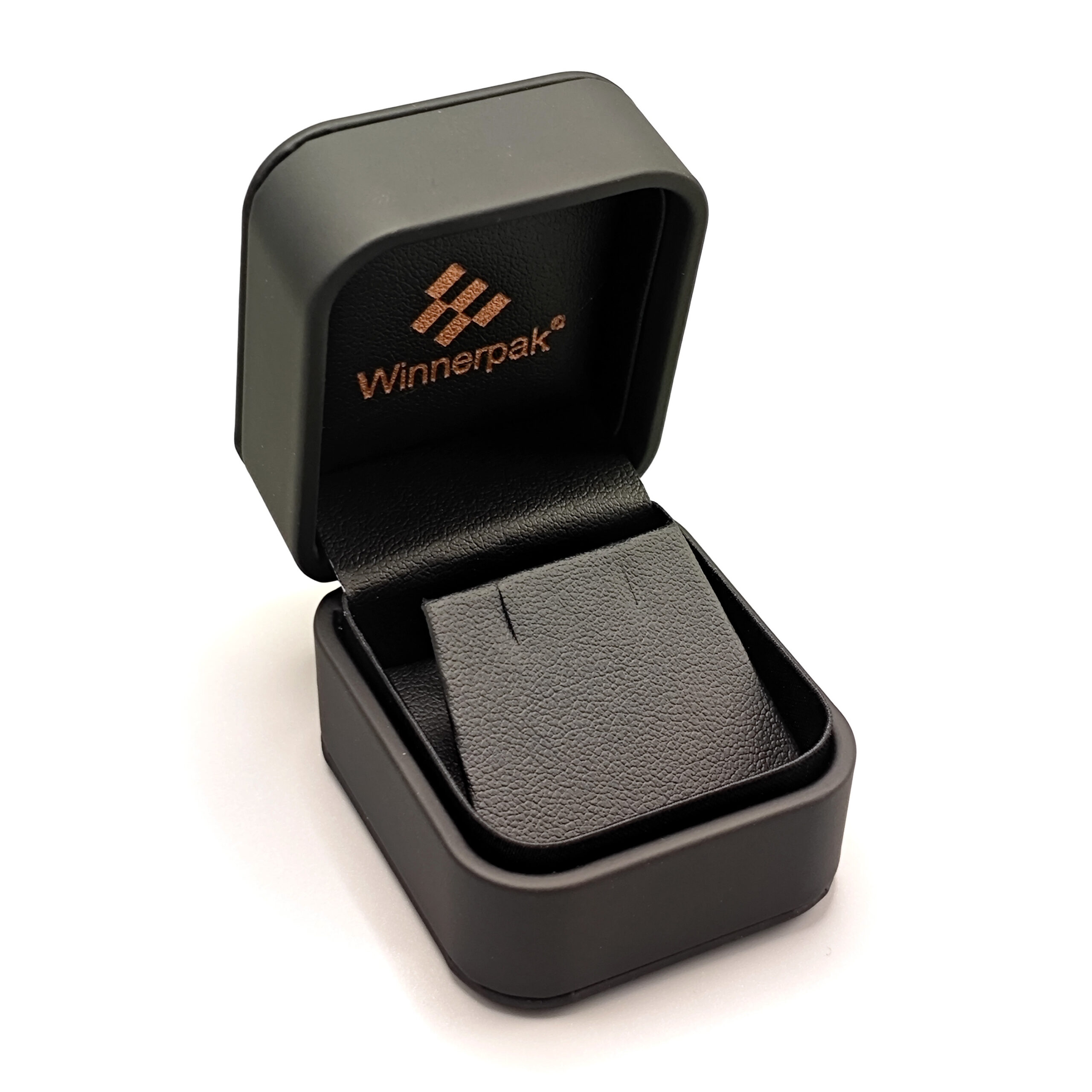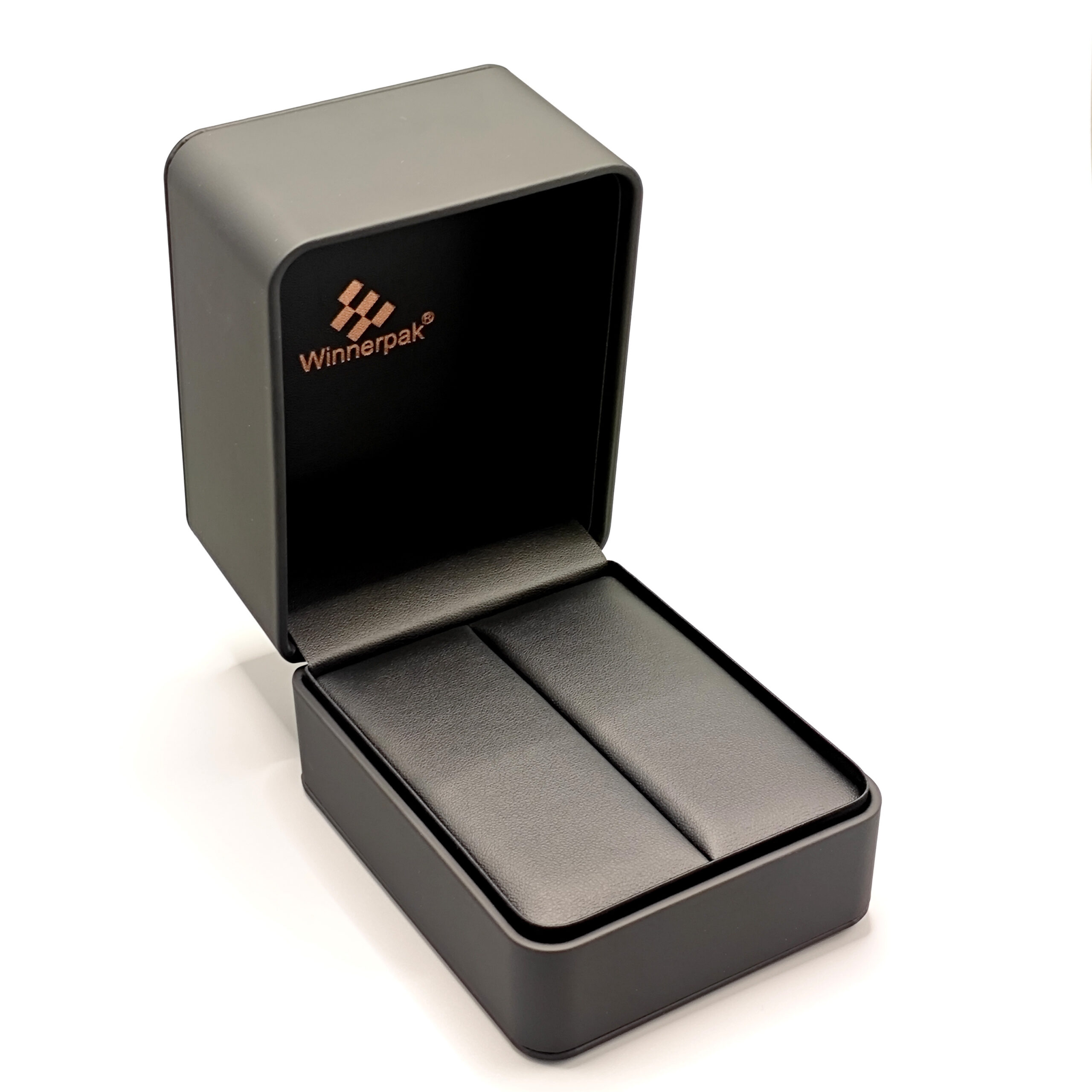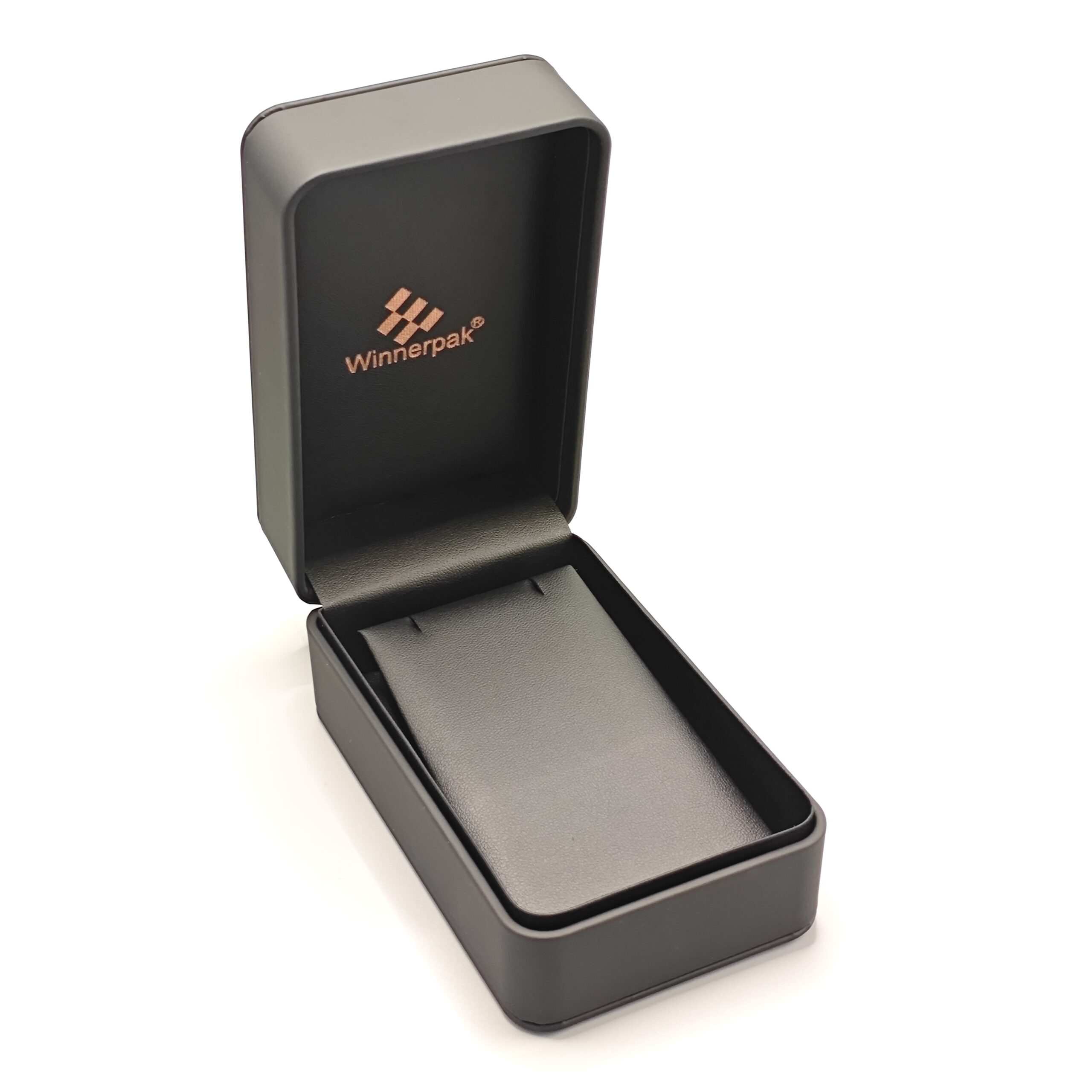 The men’s jewelry packaging line RP06B has sturdy PS frames with a black silk-touch PU leather finish, rounded edges, and an upper-and-lower veneer design. The lid’s delicate black embossed emblem gives it a sophisticated, manly appearance. To produce a high-end, unified presentation for large orders (MOQ 2000), your brand mark can be printed on the case’s interior and lid or embossed or debossed.