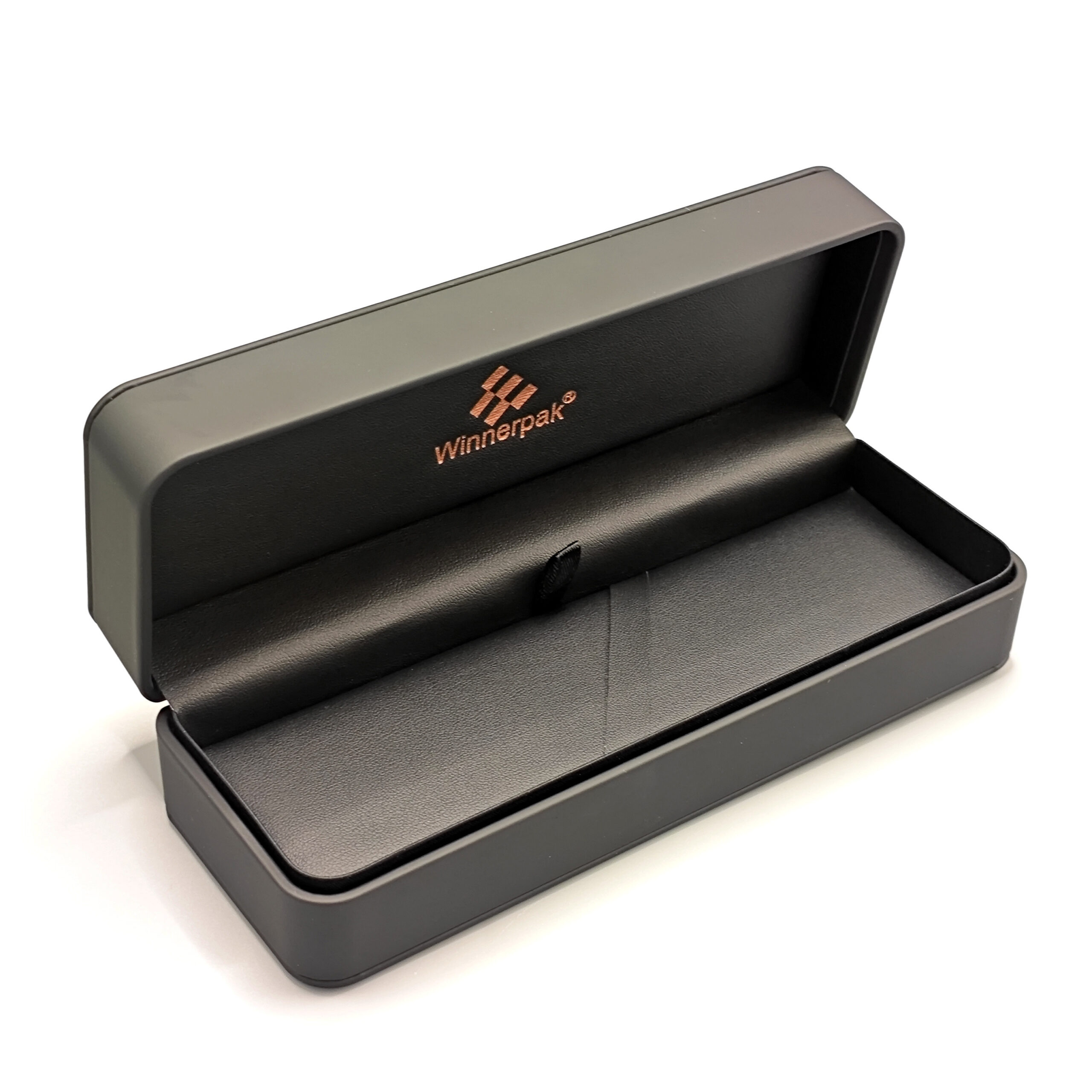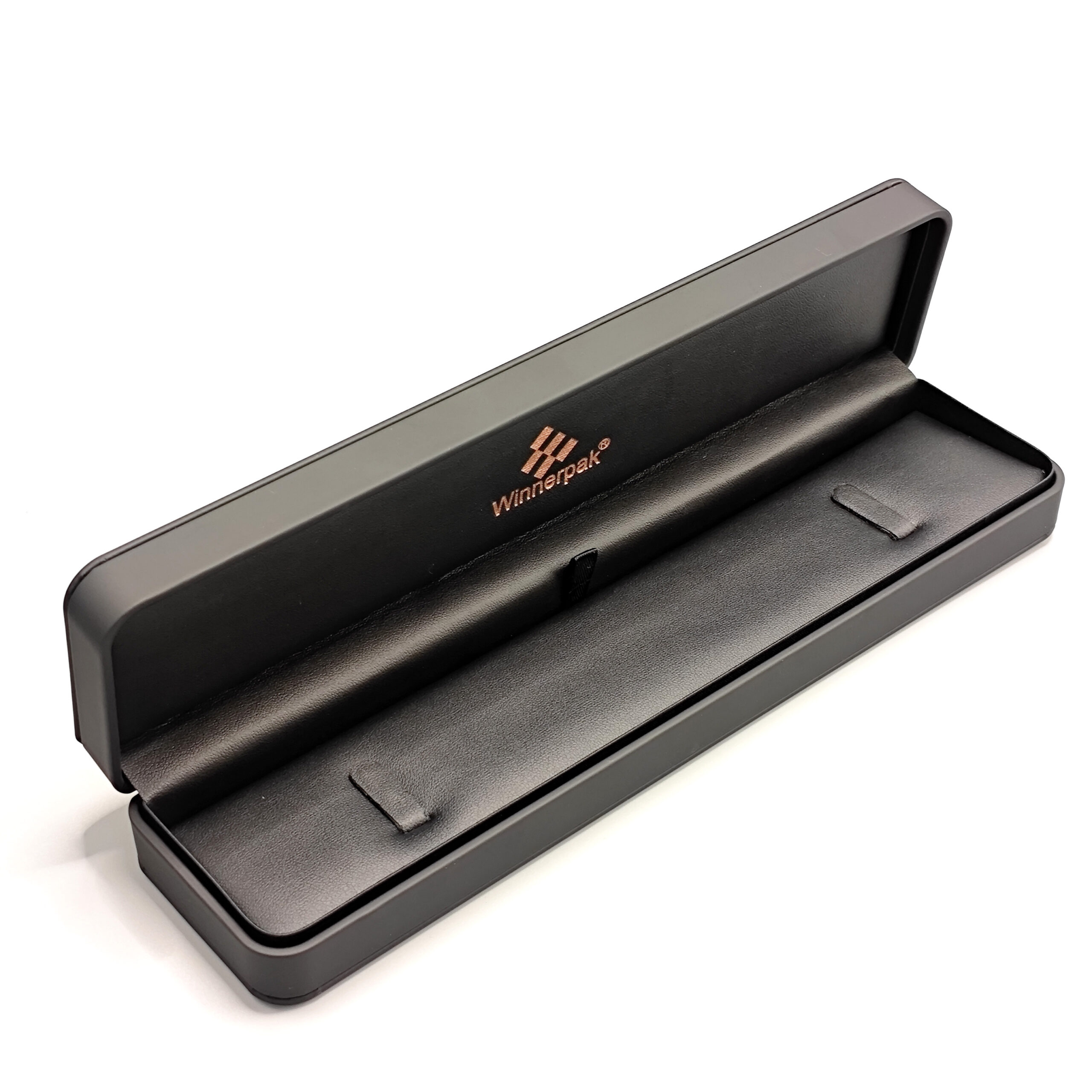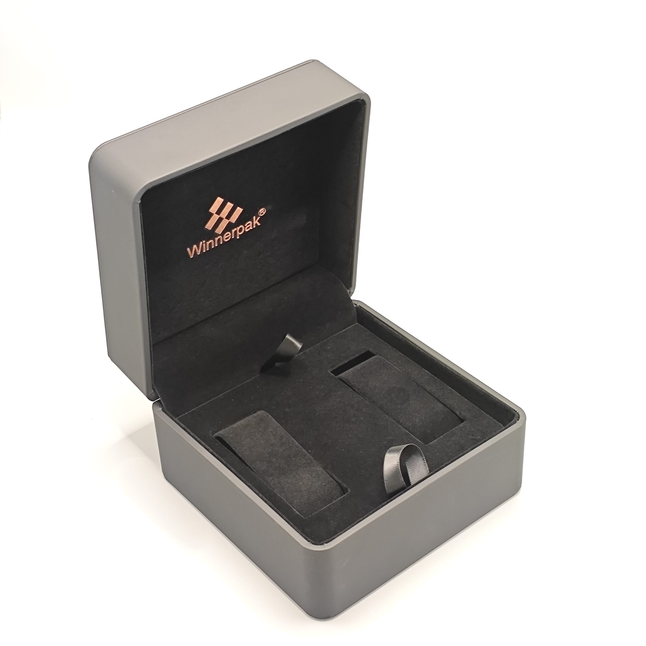 The RP06B series, made for men’s collections, has rounded edges, a veneer upper and bottom, and black silk-touch PU leather encased in sturdy PS frames. For a chic, understated appearance, the leather surface of the lid can have a delicate black embossed logo. For a fully customized unboxing experience, your business logo can be printed on the interior and on the lid, or it can be embossed or debossed for large orders (MOQ 2000).