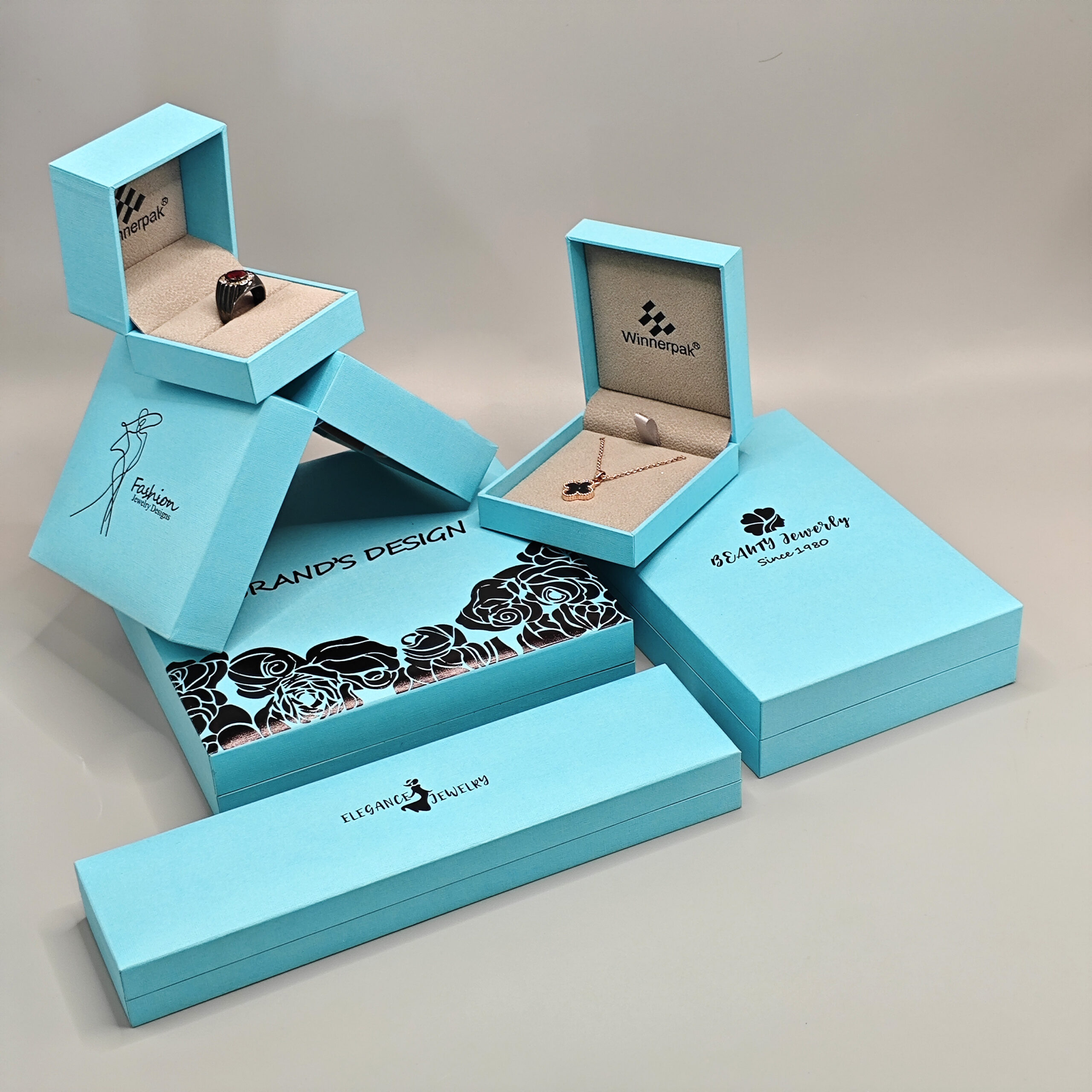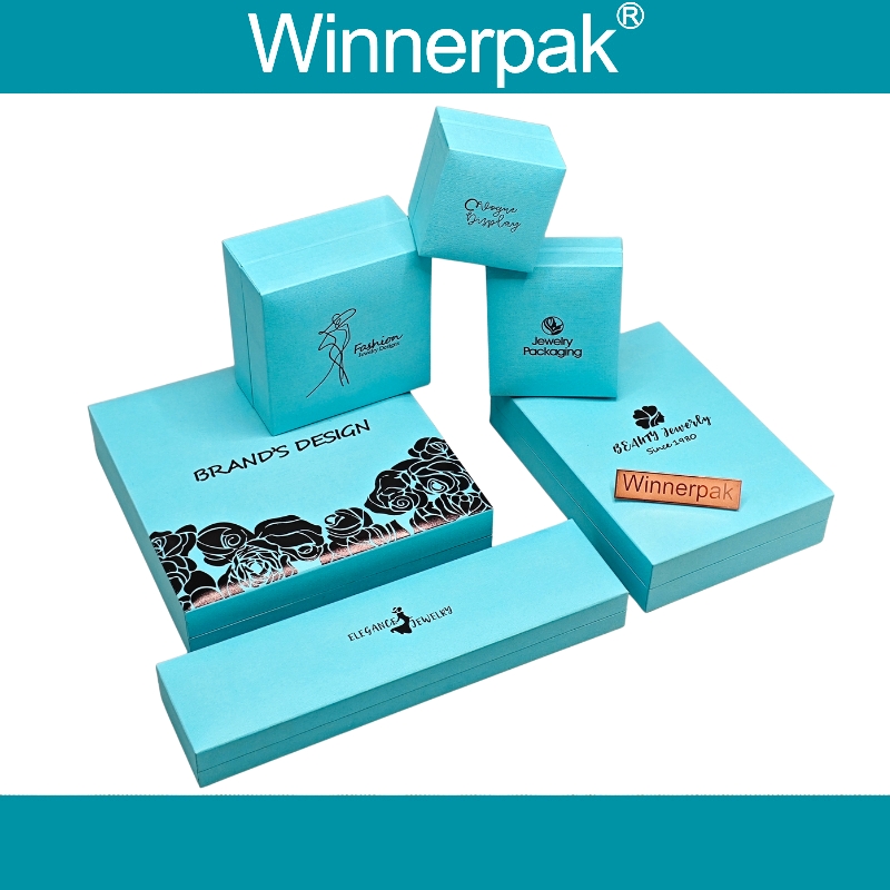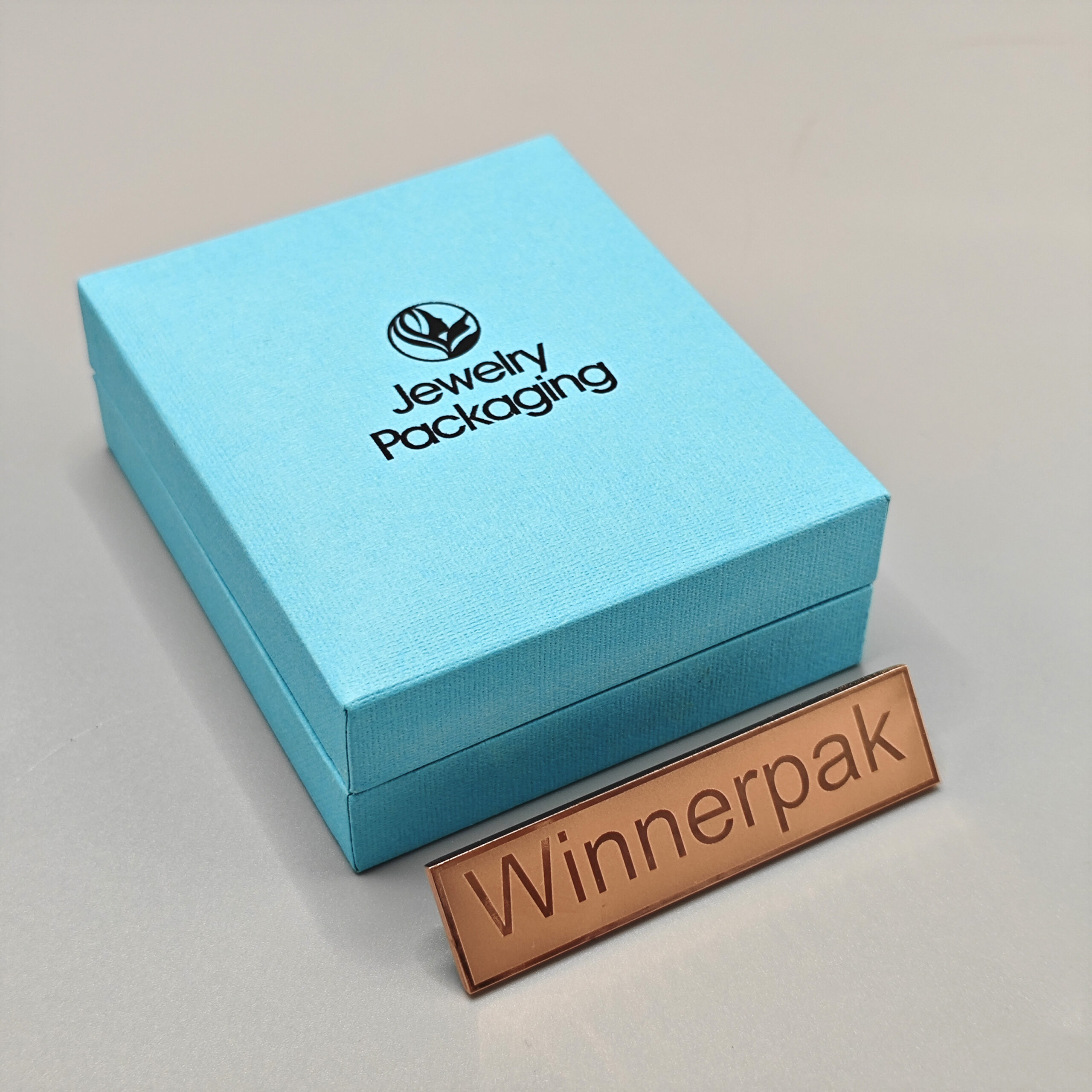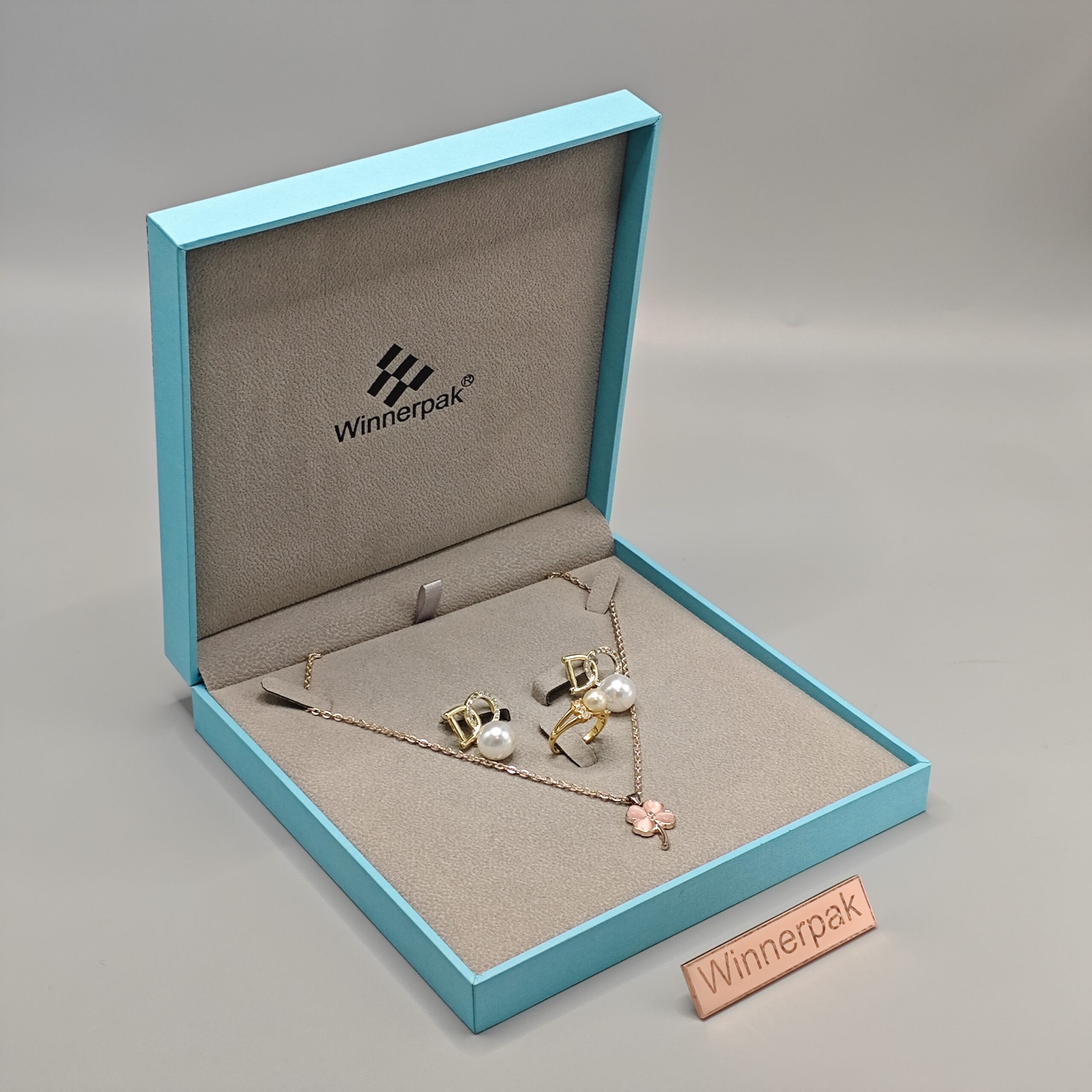 Learn about Winnerpak’s SC01B series, which are high-end wholesale jewelry boxes with a straight-corner PS frame wrapped in sophisticated lake blue fancy paper. To add a sense of elegance, the lid has a concealed cushion pad for a subtly curved top. Perfect for customized retail packaging, custom jewelry boxes with logo printing (a digital image or brand logo) on the lid or within the velvet liner are available. Customization MOQ: 1,000 pieces. Perfect as luxury jewelry packaging options, jewelry gift boxes, or cardboard jewelry boxes.