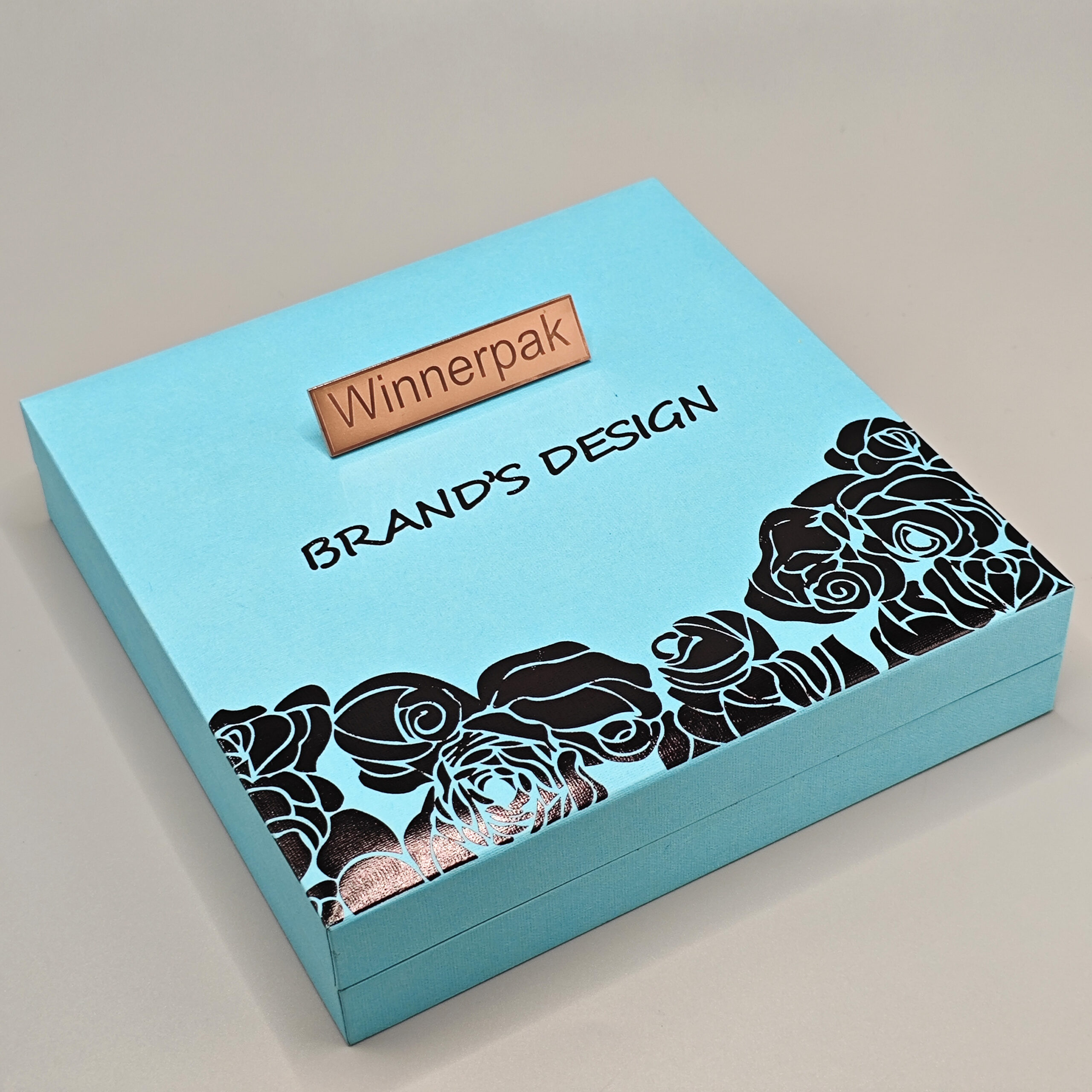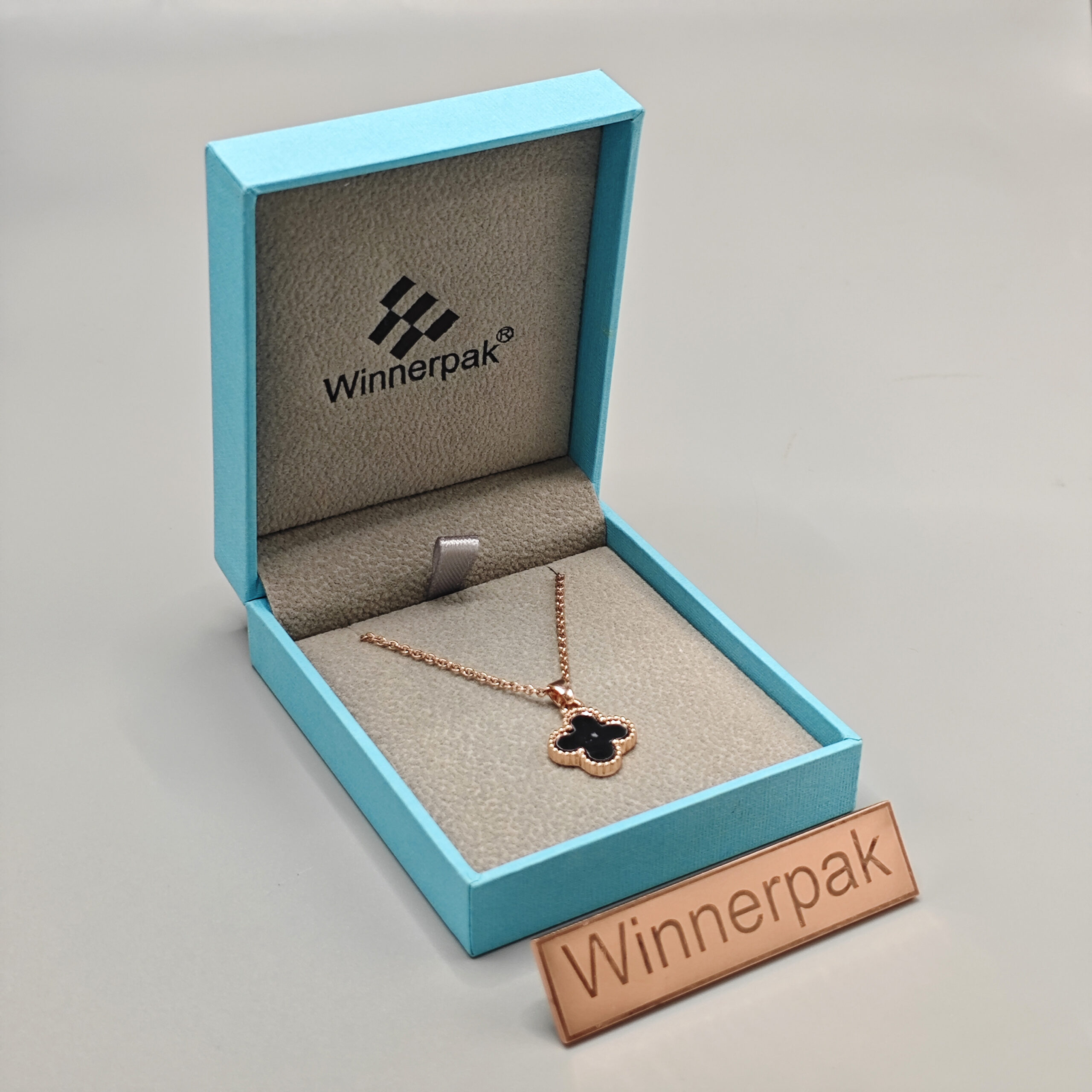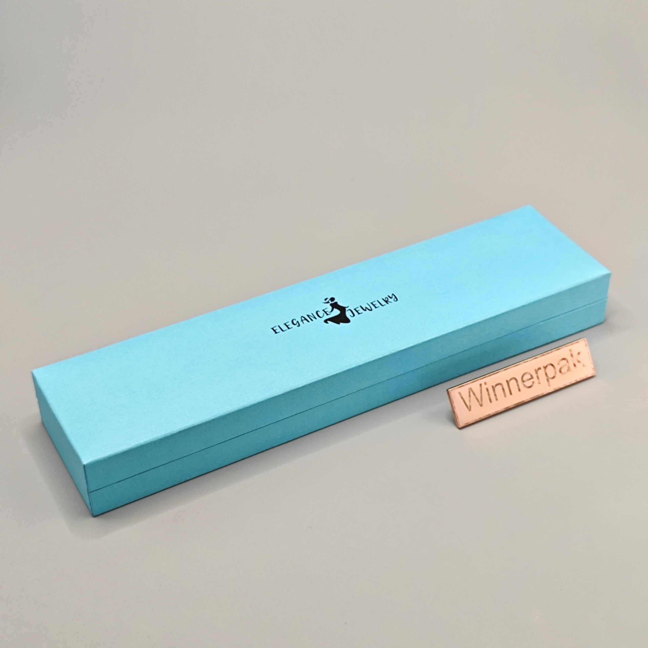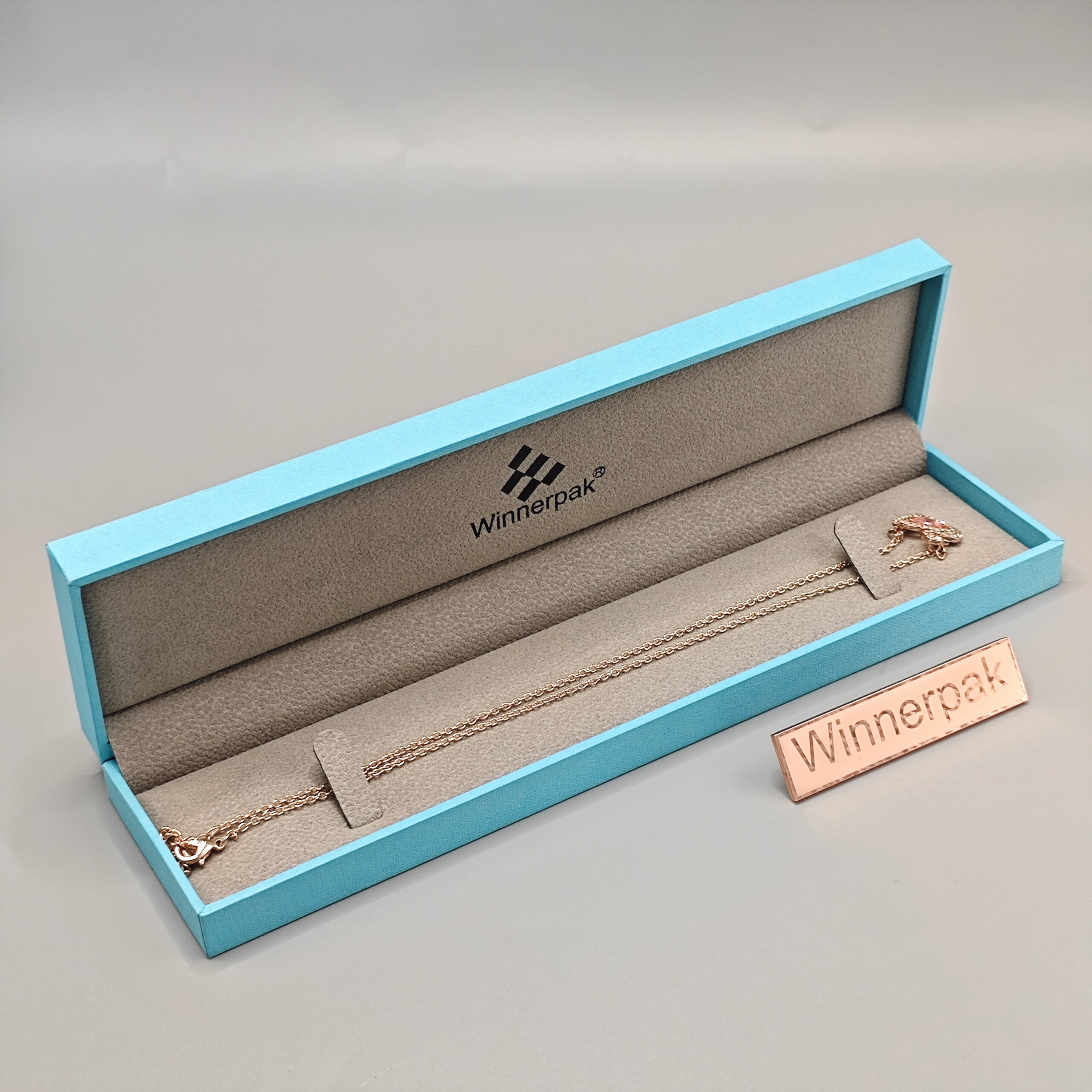 Learn about Winnerpak’s SC01B series, which are high-end wholesale jewelry boxes with a straight-corner PS frame wrapped in sophisticated lake blue fancy paper. To add a sense of elegance, the lid has a concealed cushion pad for a subtly curved top. Perfect for customized retail packaging, custom jewelry boxes with logo printing (a digital image or brand logo) on the lid or within the velvet liner are available. Customization MOQ: 1,000 pieces. Perfect as luxury jewelry packaging options, jewelry gift boxes, or cardboard jewelry boxes.
