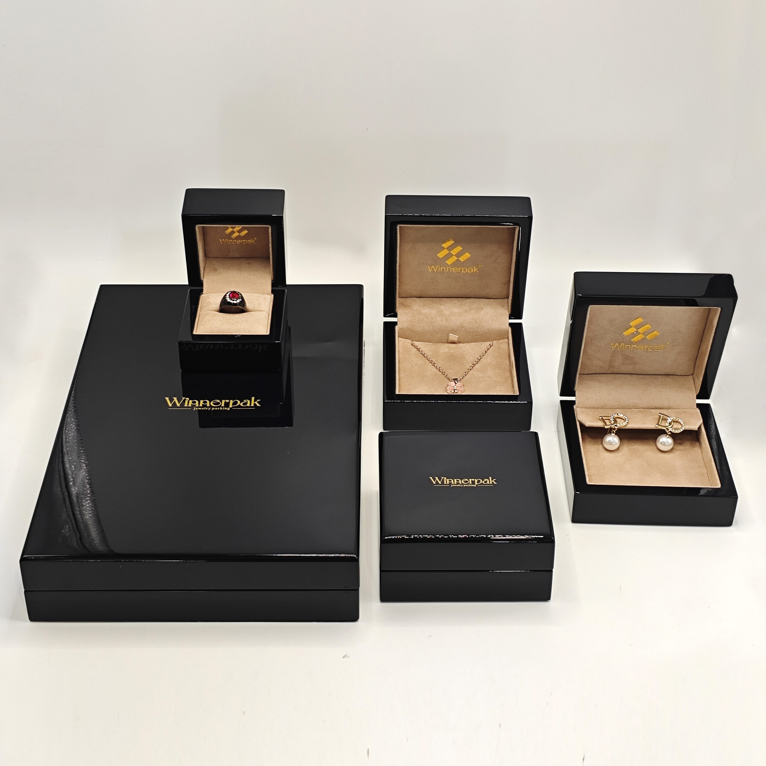 The WHG25 series transforms the concept of wooden display boxes into true jewelry showcases. Six layers of hand-applied navy lacquer create a mirror-like piano finish that speaks quality before your customer even opens the box. As one of China’s premier jewelry box manufacturers, Winnerpak crafts these wood jewelry gift boxes with meticulous attention to detail, ensuring each piece becomes a cherished keepsake alongside the jewelry it presents.